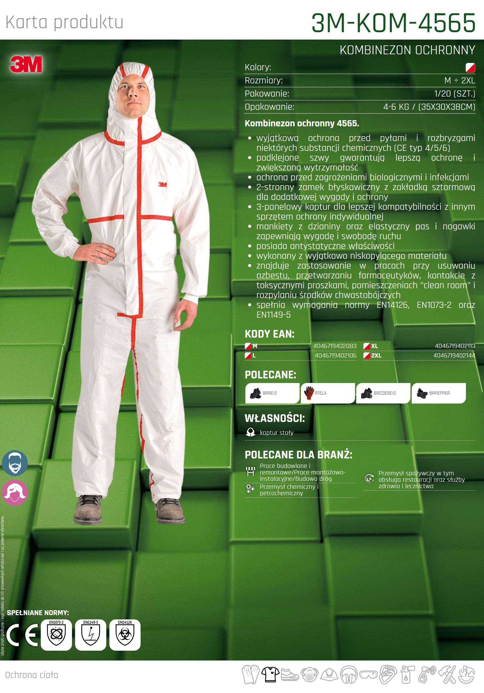 – wyjątkowa ochrona przed pyłami i rozbryzgami niektórych substancji chemicznych (CE typ 4/5/6)