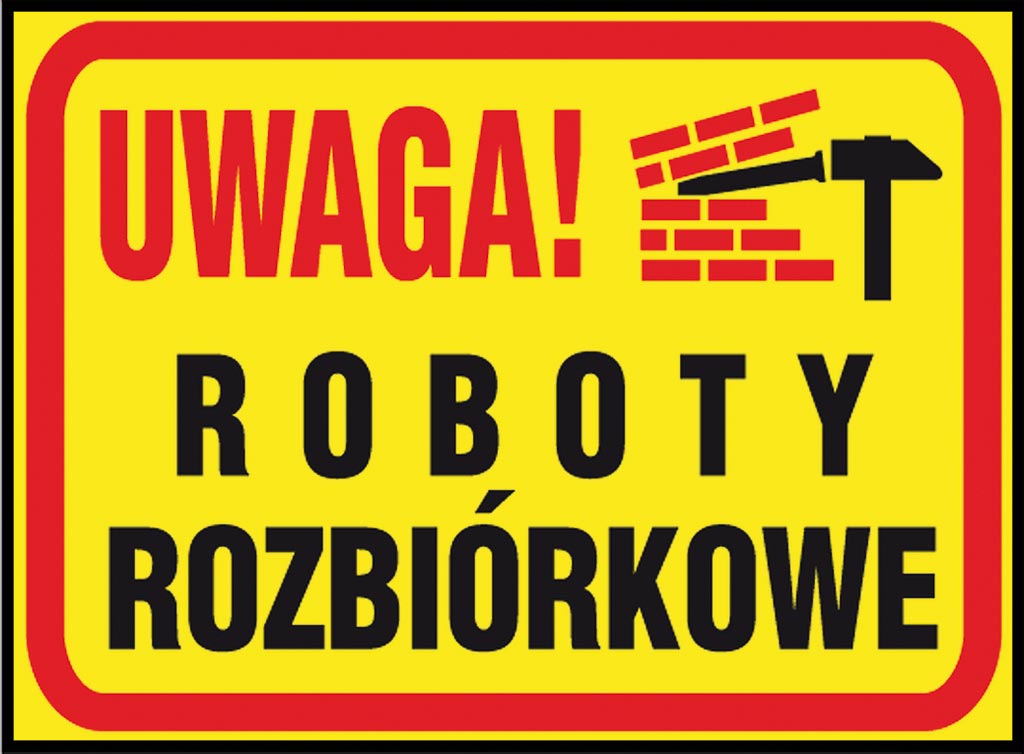 Tablica budowlana „Uwaga! Roboty rozbiórkowe”.