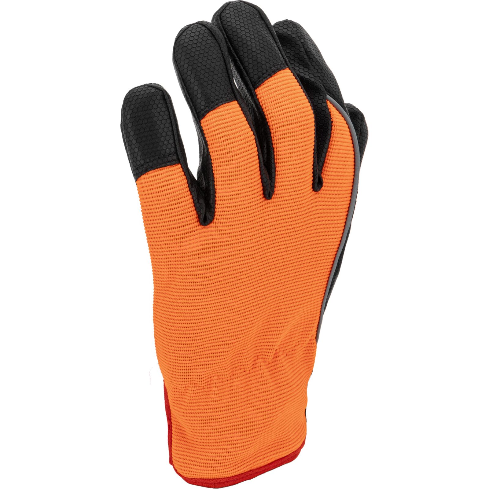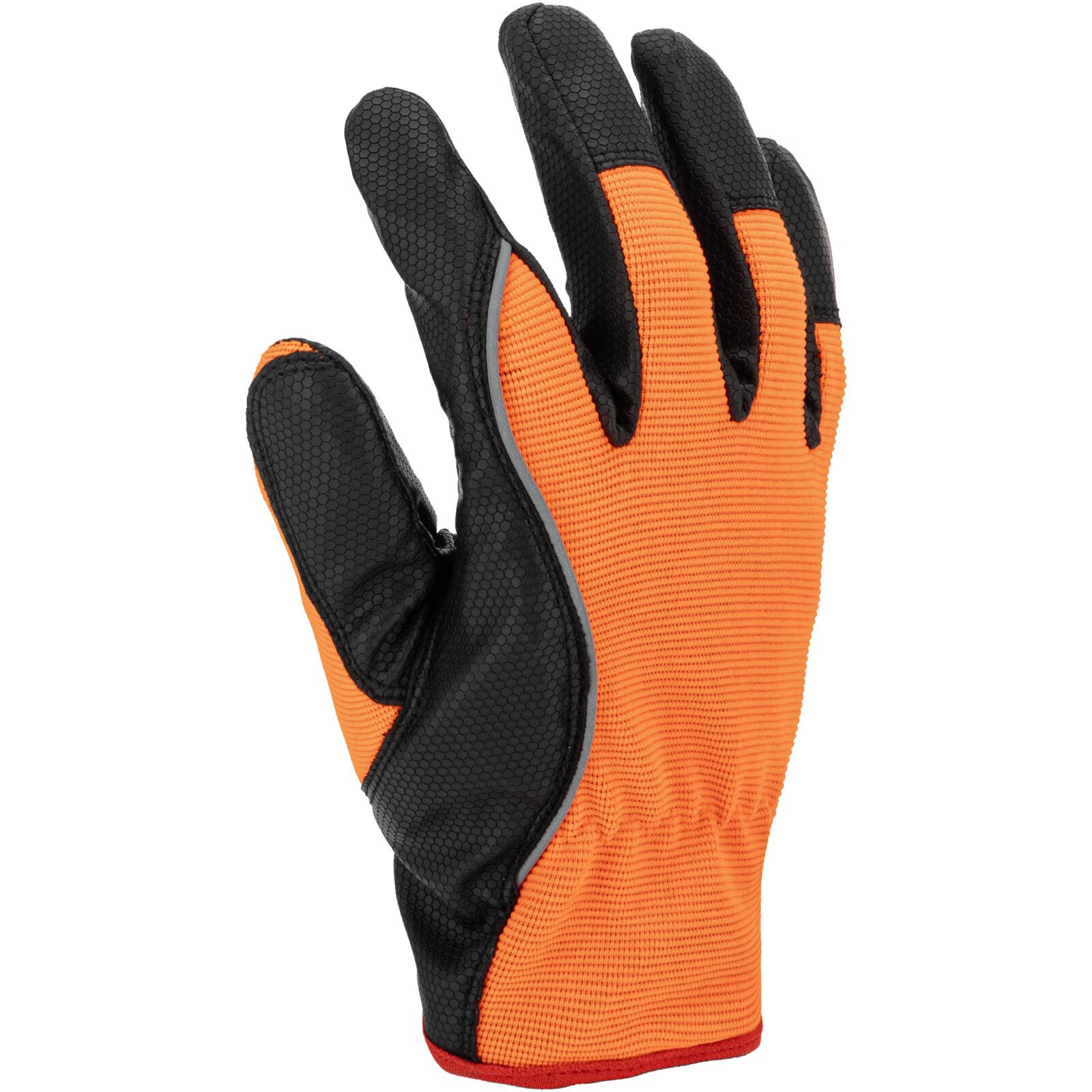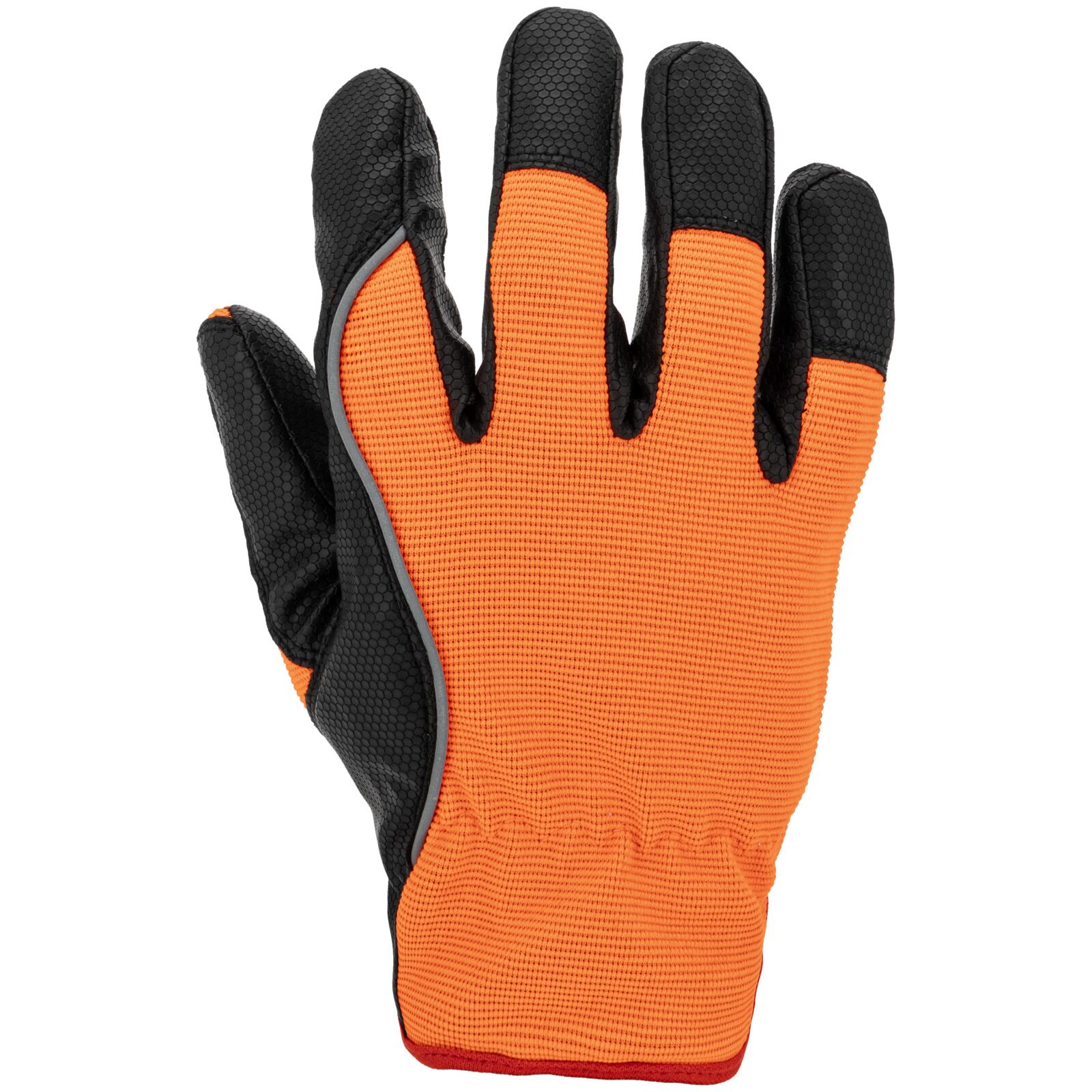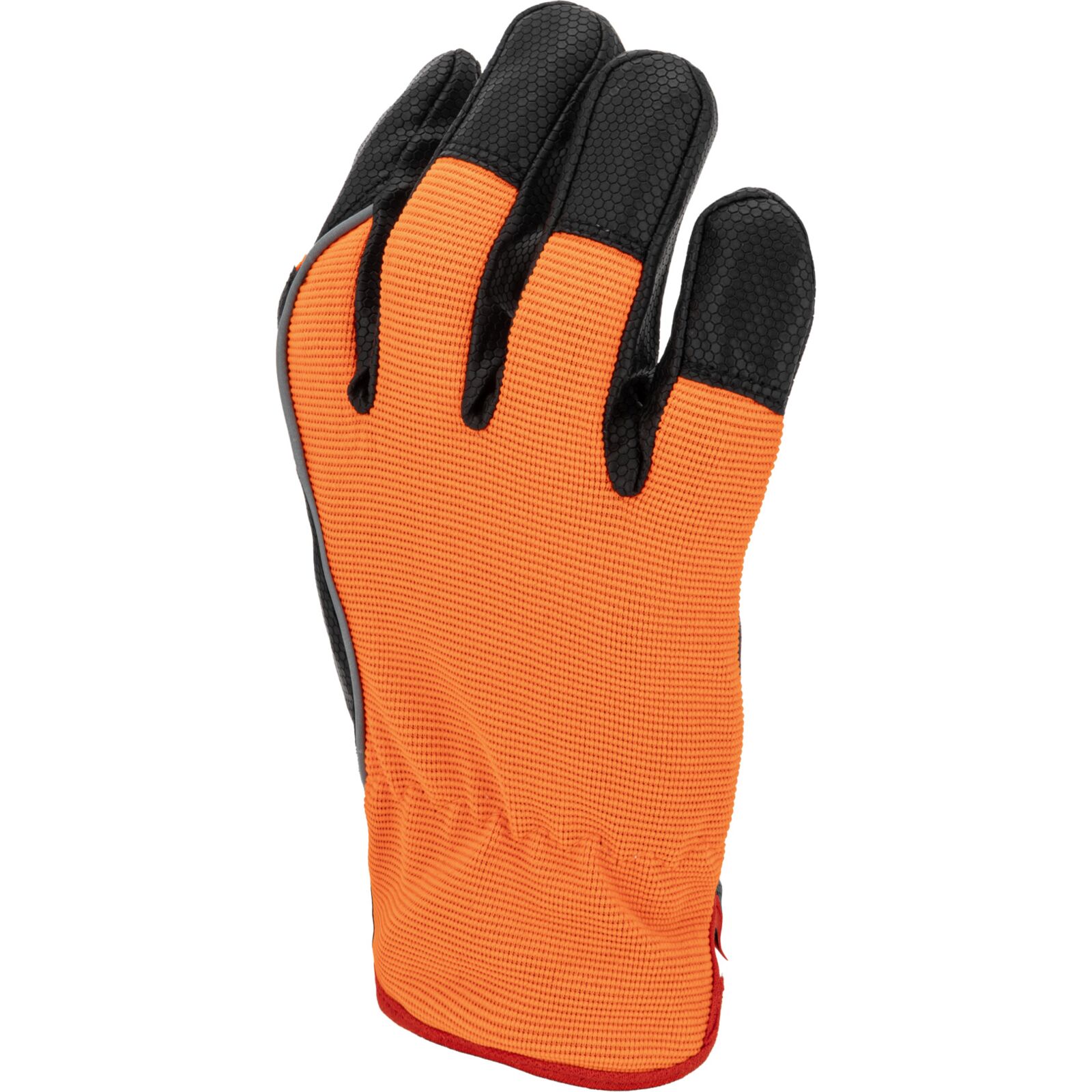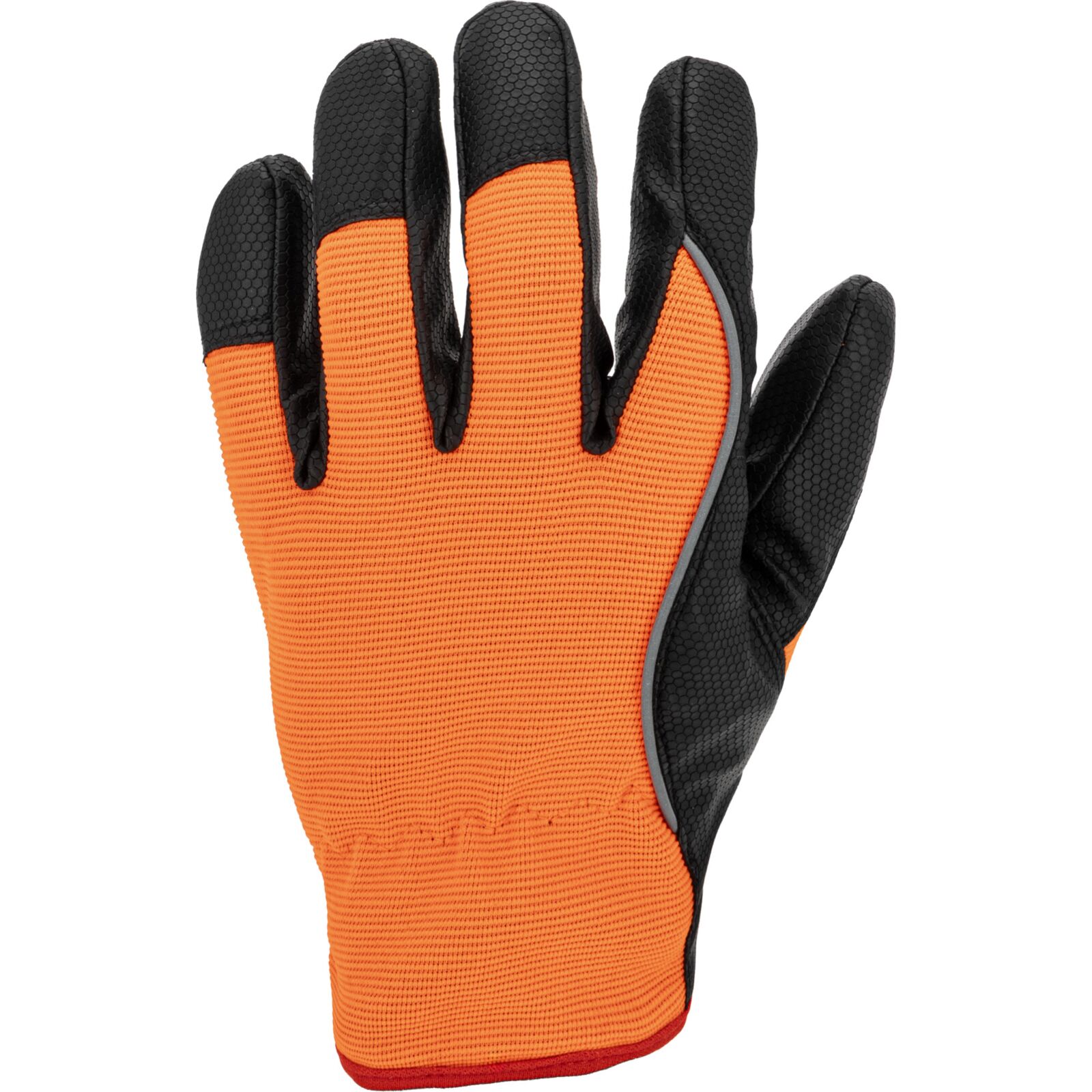Część chwytna została wykonana z jednego kawałka materiału, co zwiększa trwałość rękawicy i ogranicza ryzyko przetarć w najbardziej obciążonych miejscach. Wierzchnia część wykonana jest z elastycznego materiału o podwyższonej widoczności, który zapewnia dobre dopasowanie do dłoni oraz poprawia bezpieczeństwo pracy.