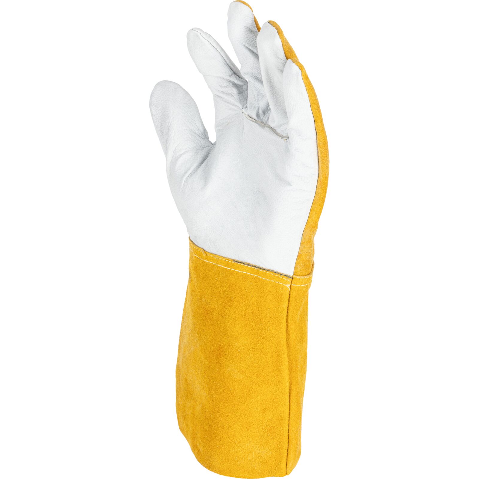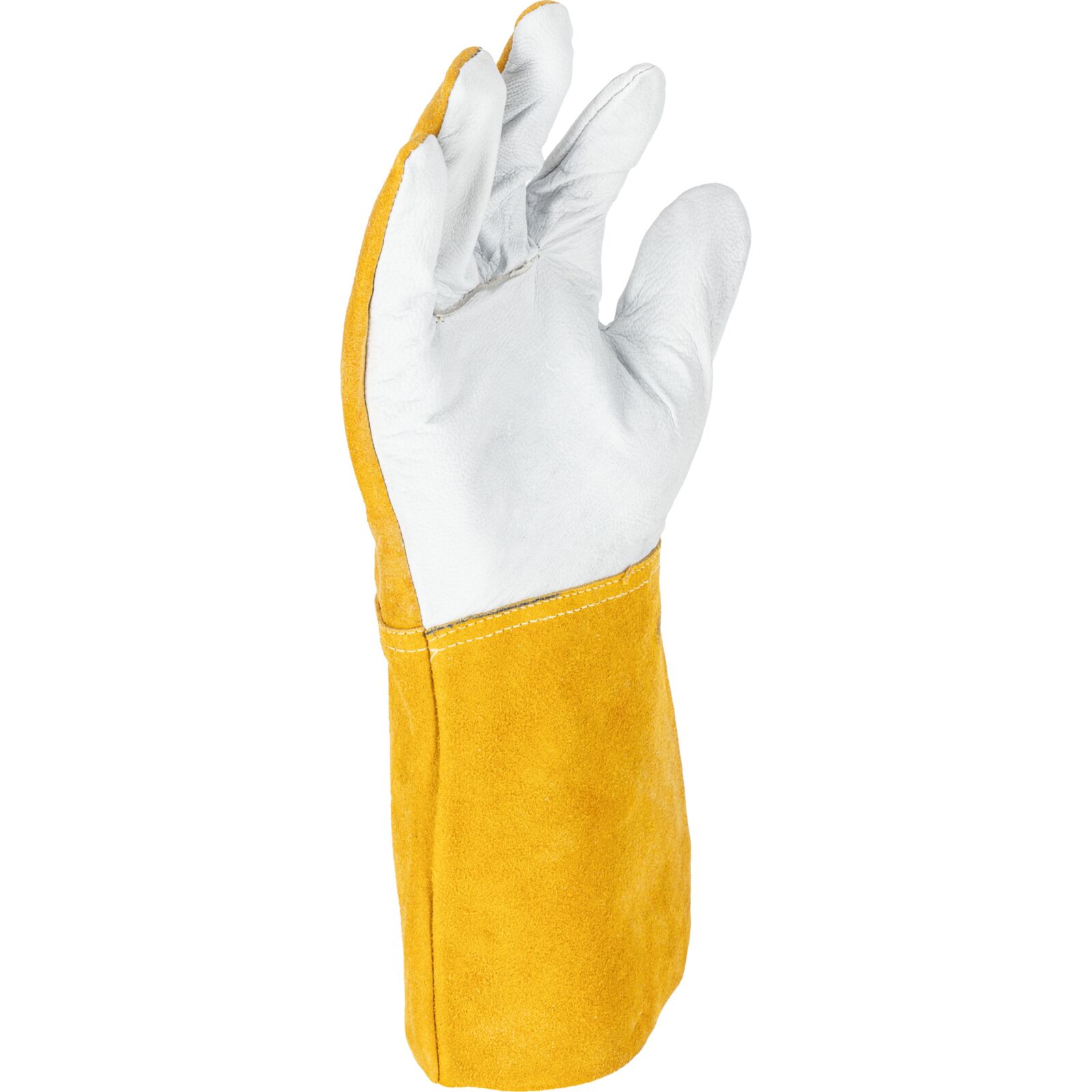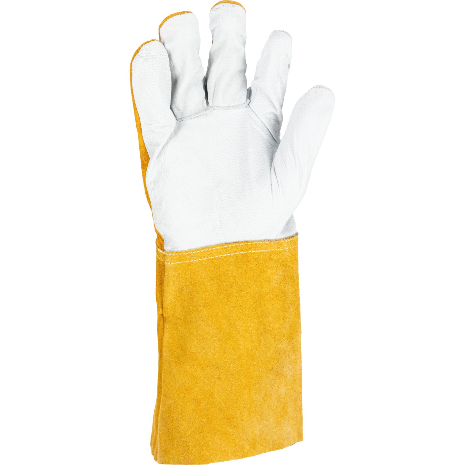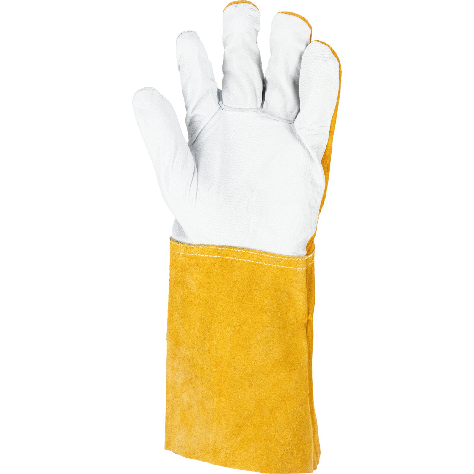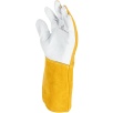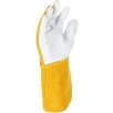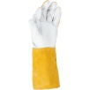 Część chwytna została wykonana z jednego kawałka skóry, co zwiększa wytrzymałość rękawicy i poprawia pewność chwytu podczas pracy. Zastosowanie niepalnej nici na szwach podnosi odporność na działanie wysokich temperatur i zwiększa bezpieczeństwo użytkownika.