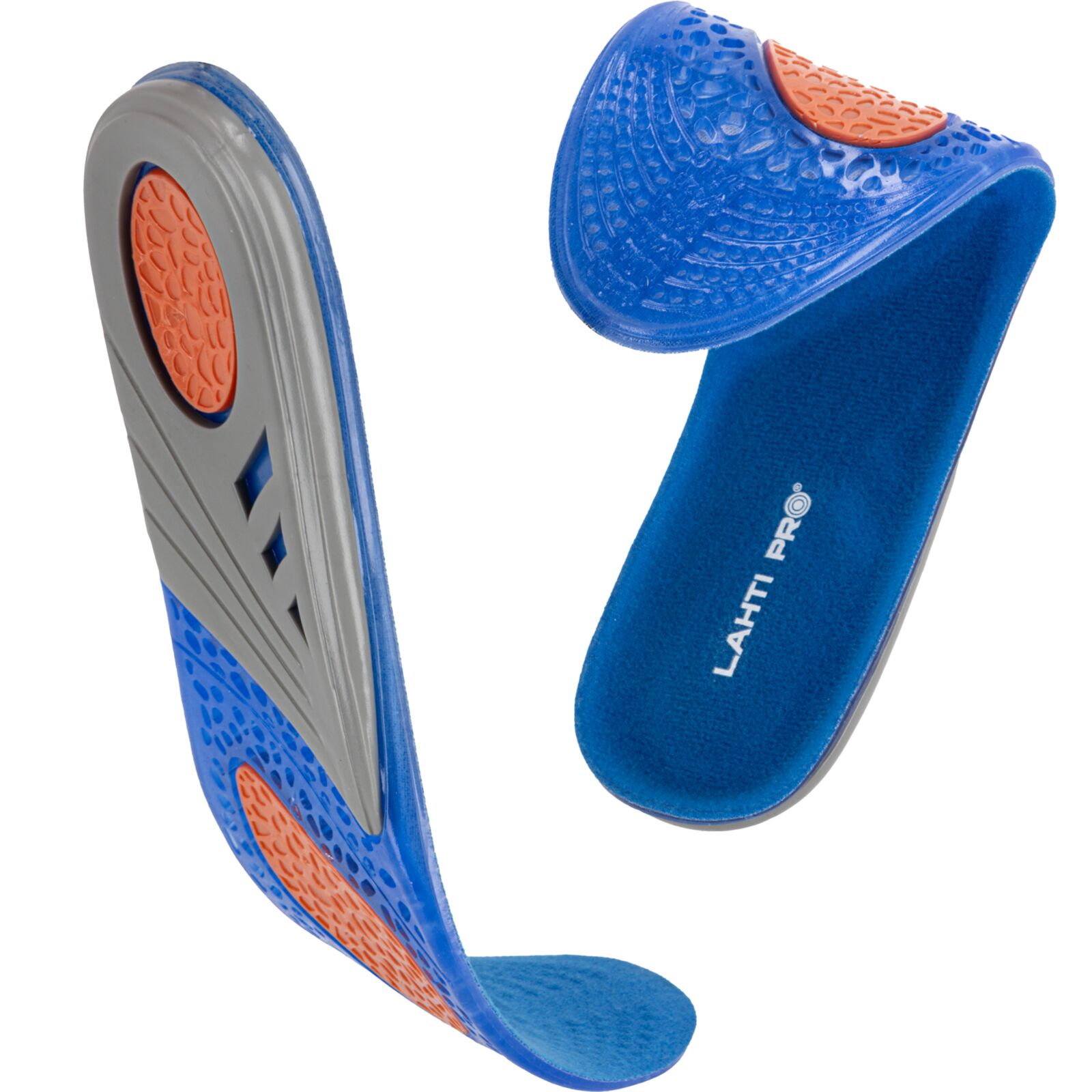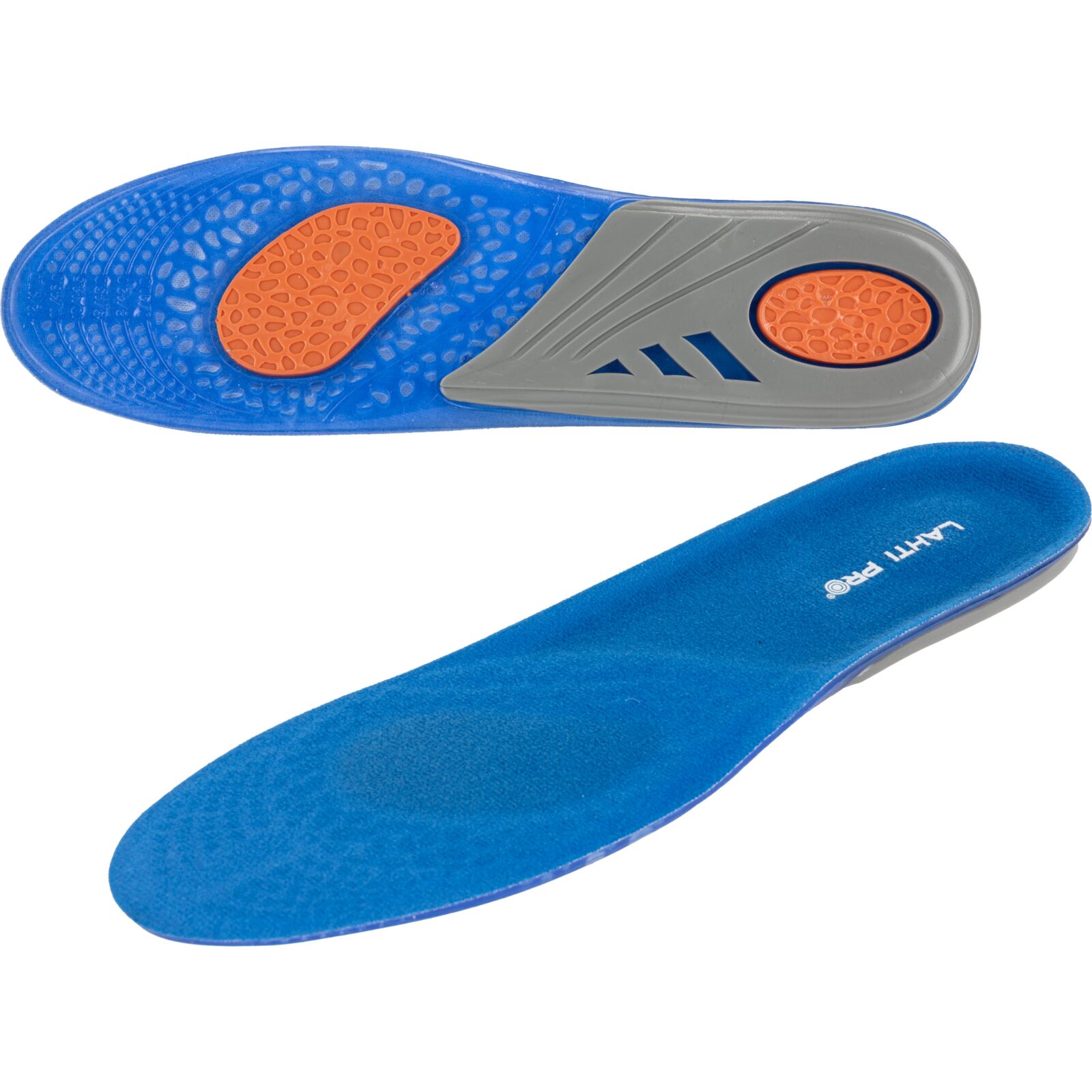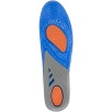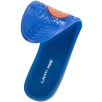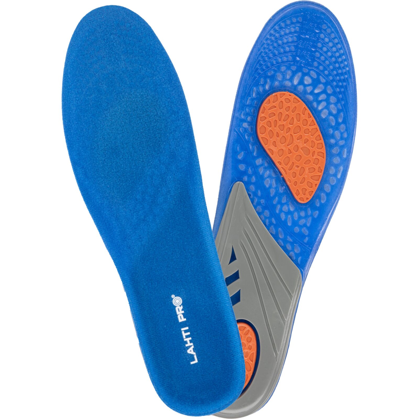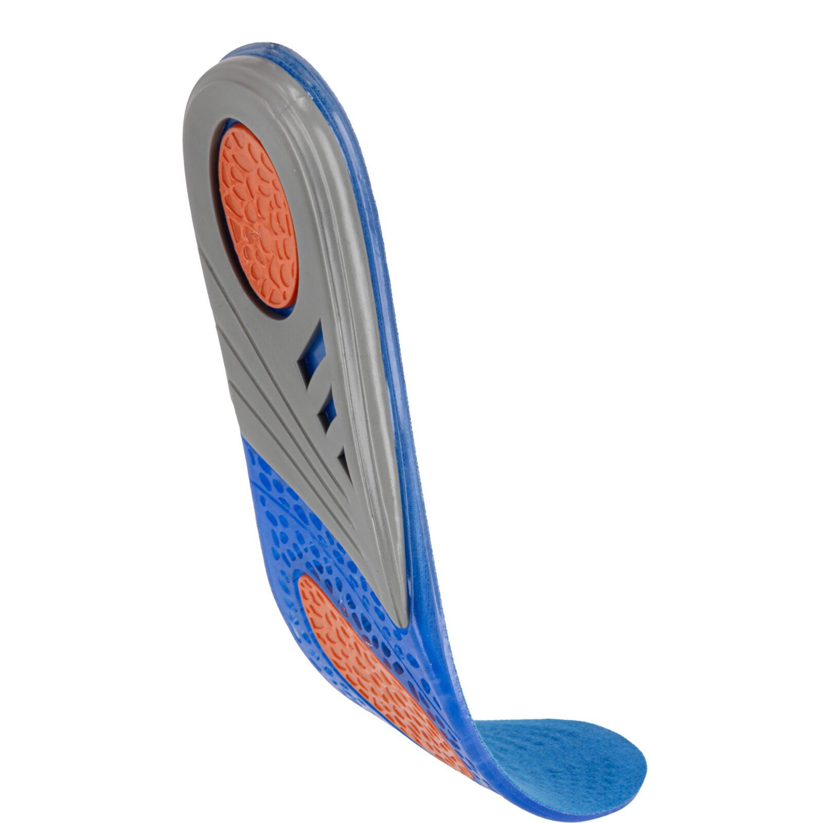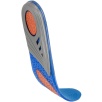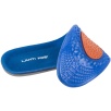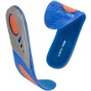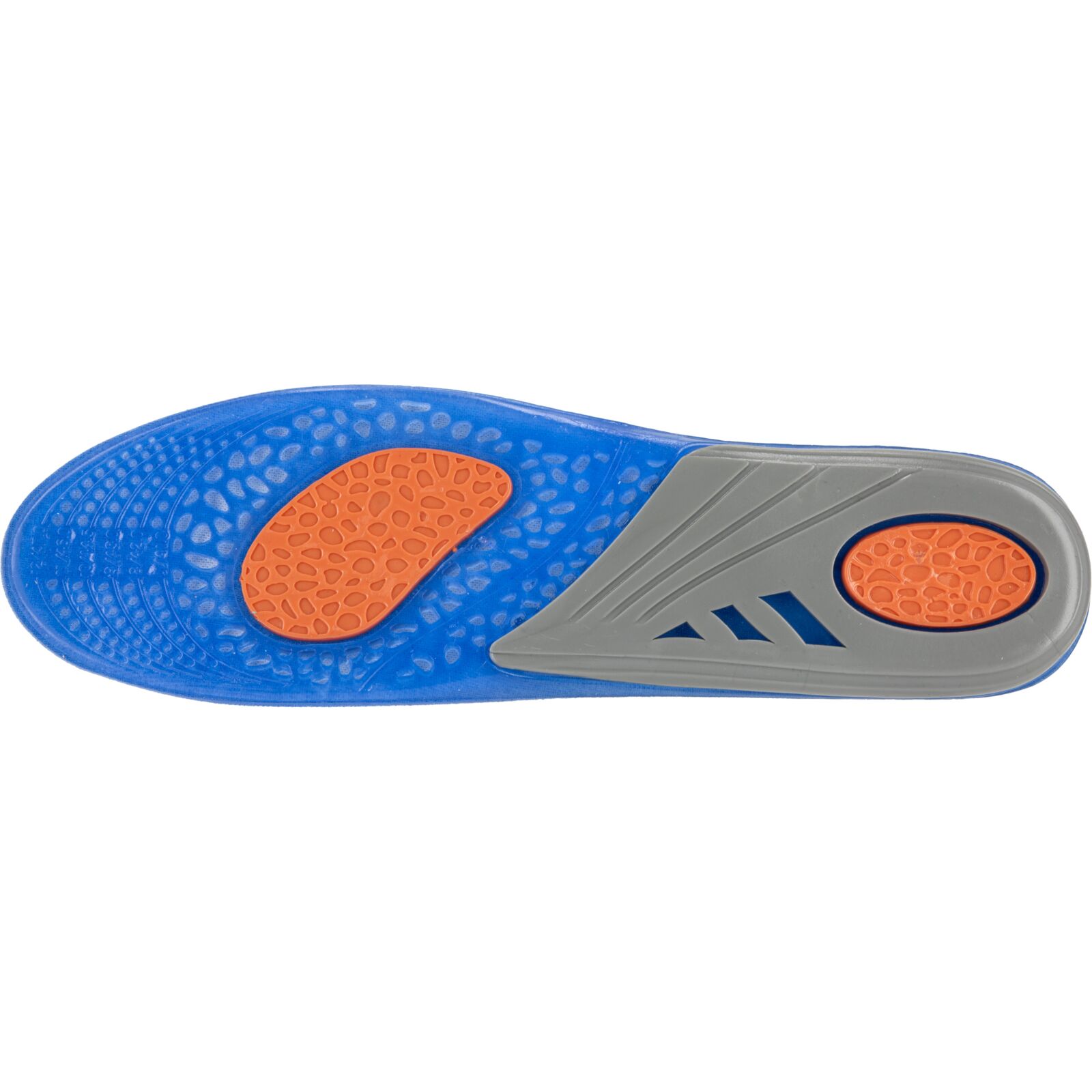Wkładki wykonano z materiału TPE połączonego z dzianiną poliestrową. Żel o różnym stopniu gęstości został zaprojektowany w trzech strefach funkcjonalnych: miękki i elastyczny niebieski żel łagodzi nacisk stopy na podłoże, pomarańczowy żel pełni funkcję amortyzatora mikrowstrząsów powstających podczas kontaktu stopy z podłożem, a szary żel stabilizuje piętę, utrzymując ją w odpowiedniej pozycji oraz podtrzymuje łuk wzdłużny stopy, odciążając ją.