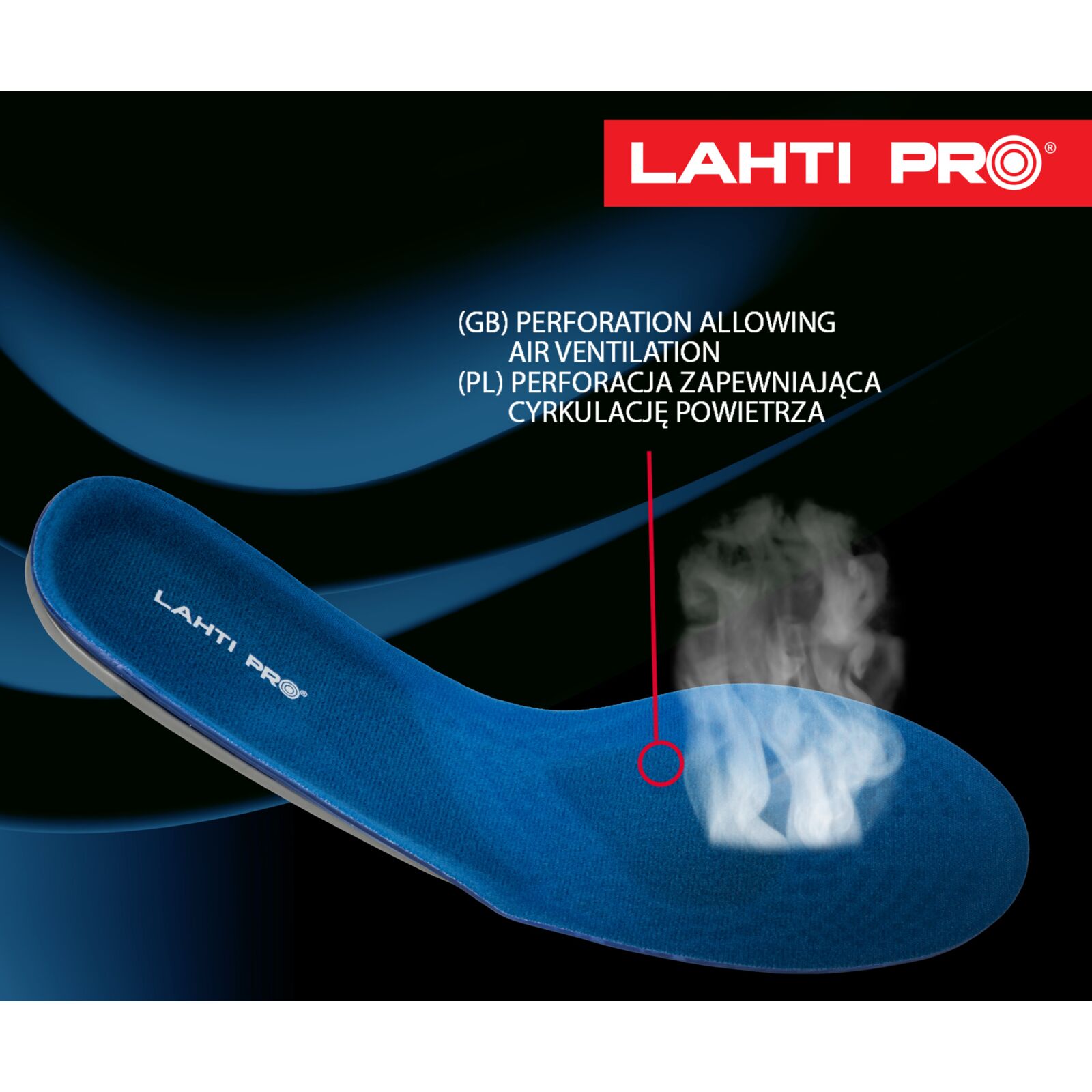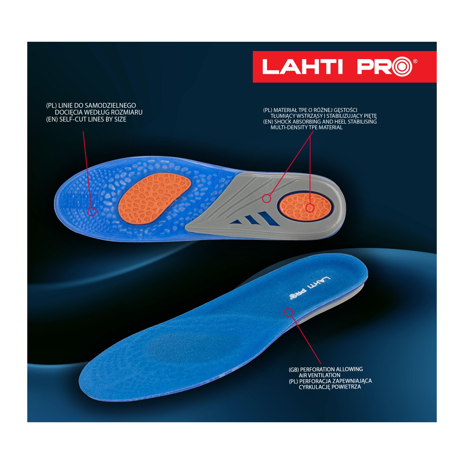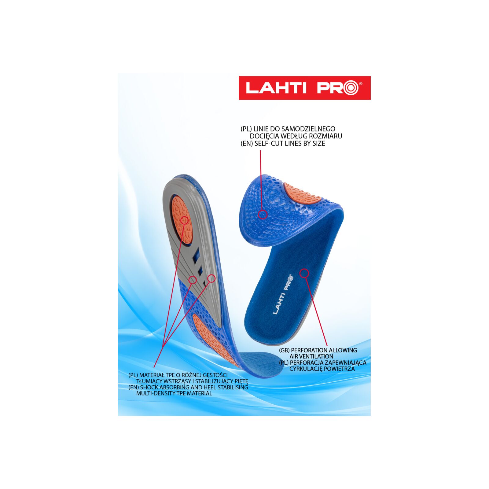 Perforacja wkładek oraz oddychająca warstwa dzianiny zapewniają cyrkulację powietrza wewnątrz obuwia, ograniczając pocenie się stóp i poprawiając higienę. Wkładki posiadają wytłoczone linie, które umożliwiają samodzielne dopasowanie rozmiaru do każdego rodzaju obuwia.