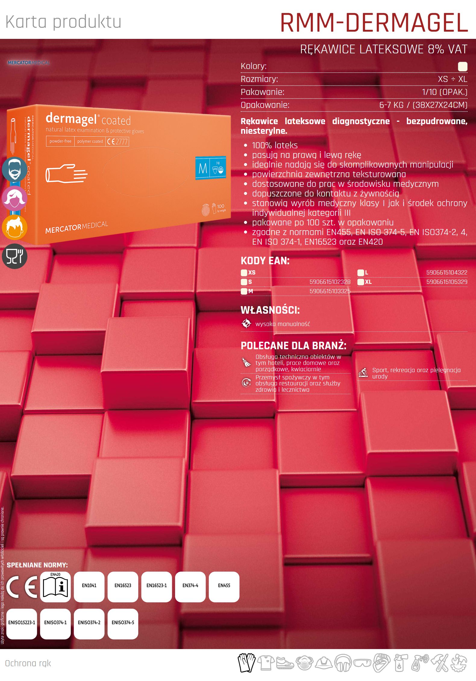 – zgodne z normami EN455, EN374-2,4, EN ISO374-5, EN ISO 374-1, EN16523 oraz EN420