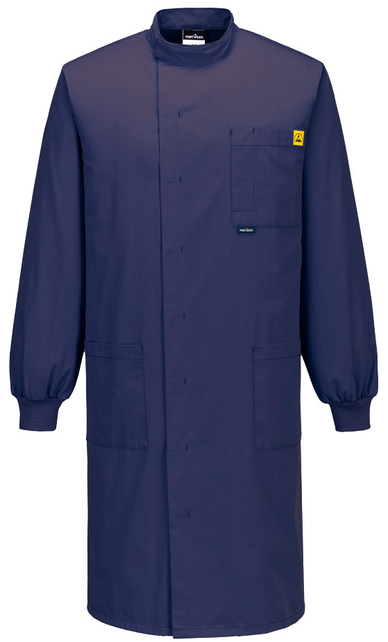 Antystatyczny fartuch ESD ma wiele sprytnych cech konstrukcyjnych. Posiada ściągacze w mankietach. Dwie dolne dodatkowe naszywane kieszenie zapewniają łatwe przechowywanie, a lewa kieszeń na klatce piersiowej posiada łatwy dostęp. Odzież jest chroniona wodoodpornym i odpornym na zabrudzenia wykończeniem Texpel.
