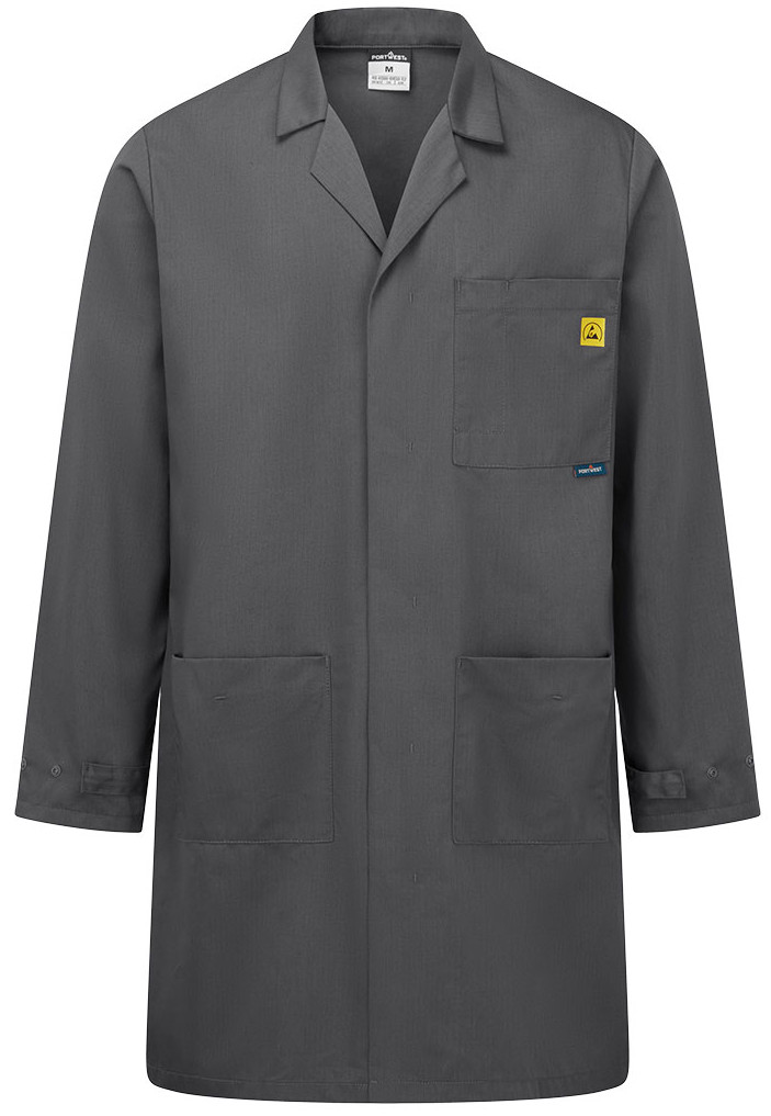 Naturalnie antystatyczny fartuch ochronny idealny do prac w środowisku zagrożenia elektrycznością statyczną. Bardzo dobrze skrojony. Posiada regulację na końcach mankietów, zapięcie na napy ukryte pod listwą, 2 kieszenie boczne i kieszonkę na klatce piersiowej.