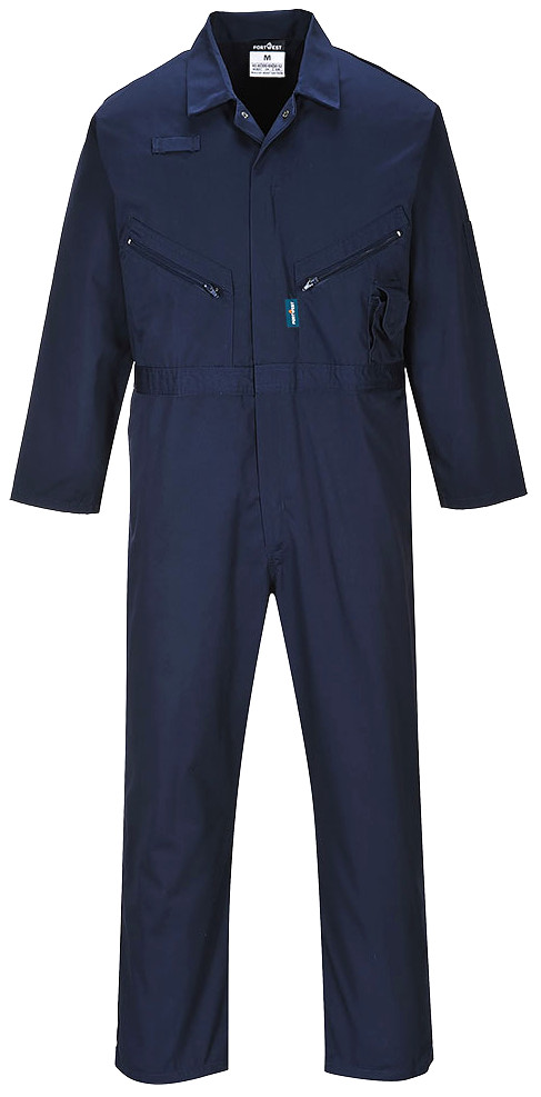 Klasyczny stylowy kombinezon roboczy zapinany na zamek błyskawiczny wykonany z wykurczonej tkaniny poliestrowo-bawełnianej. Posiada wiele kieszeni oraz uchwyt na młotek.