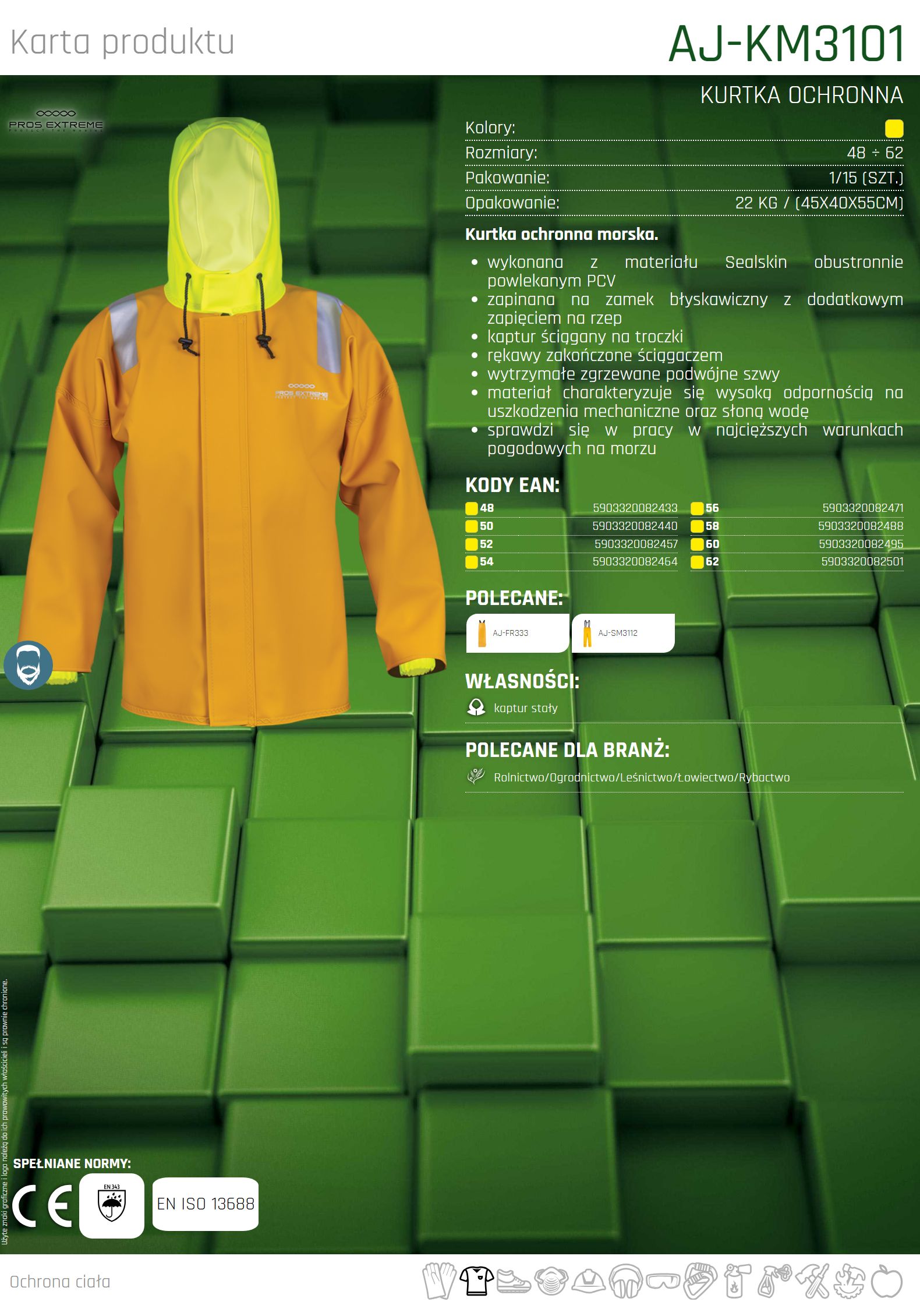 Kurtka ochronna morska została zaprojektowana, aby zapewnić maksymalną ochronę i komfort w ekstremalnych warunkach pracy na morzu. Wykonana z wysokiej jakości materiału Sealskin, powlekanego obustronnie PCV, charakteryzuje się odpornością na uszkodzenia mechaniczne, słoną wodę oraz trudne warunki pogodowe.