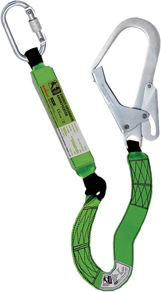 – po jednej stronie taśmy pochłaniacz energii wyposażonym w karabińczyk, po drugiej stronie stalowy hak oczkowy do rusztowań