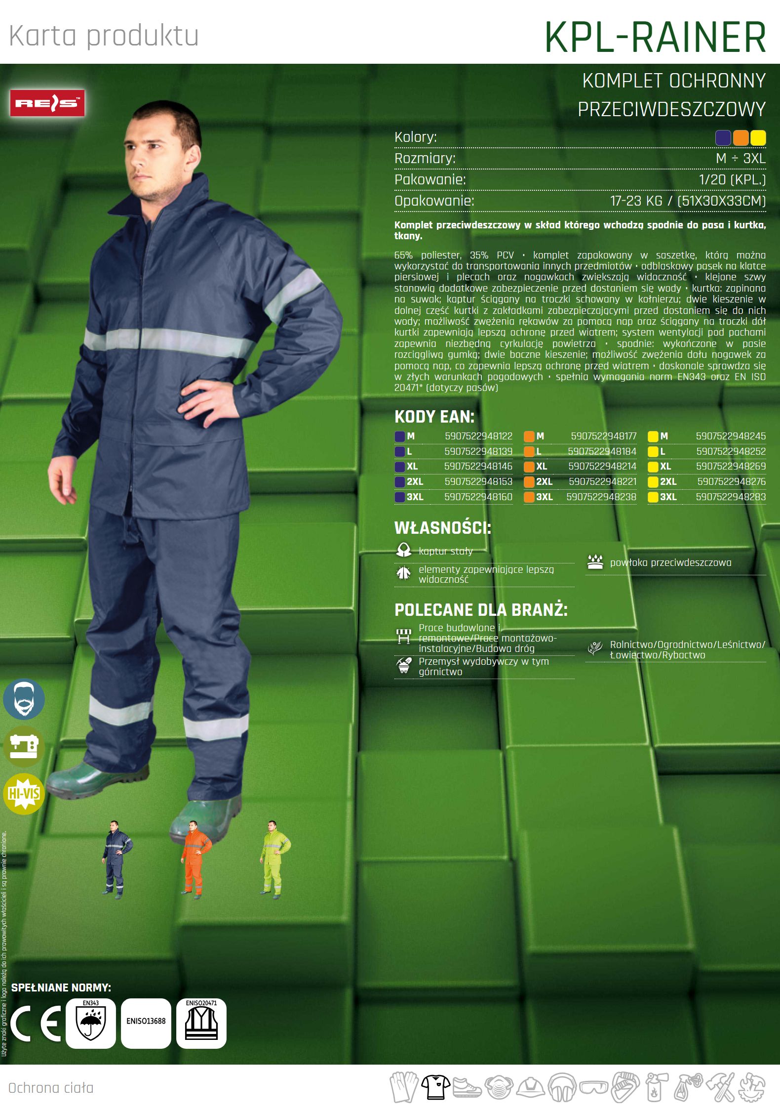 – spełnia wymagania norm EN343 oraz EN ISO 20471* (dotyczy pasów)
