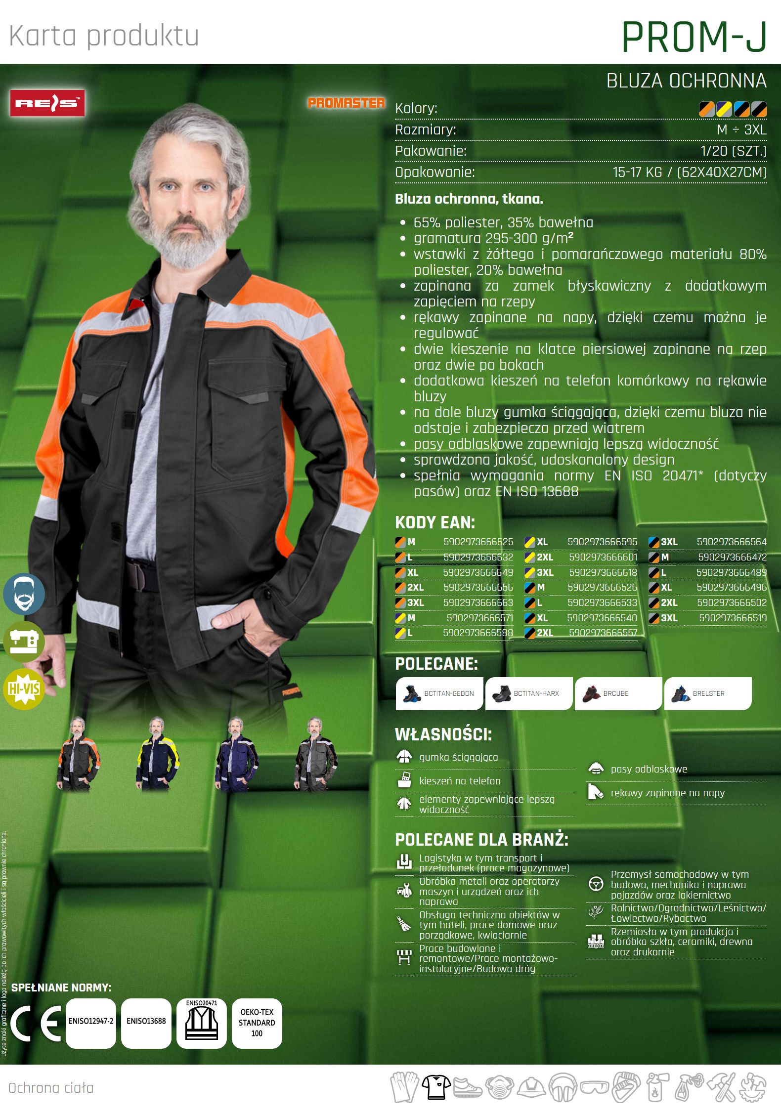 – spełnia wymagania normy EN ISO 20471* (dotyczy pasów) oraz EN ISO 13688