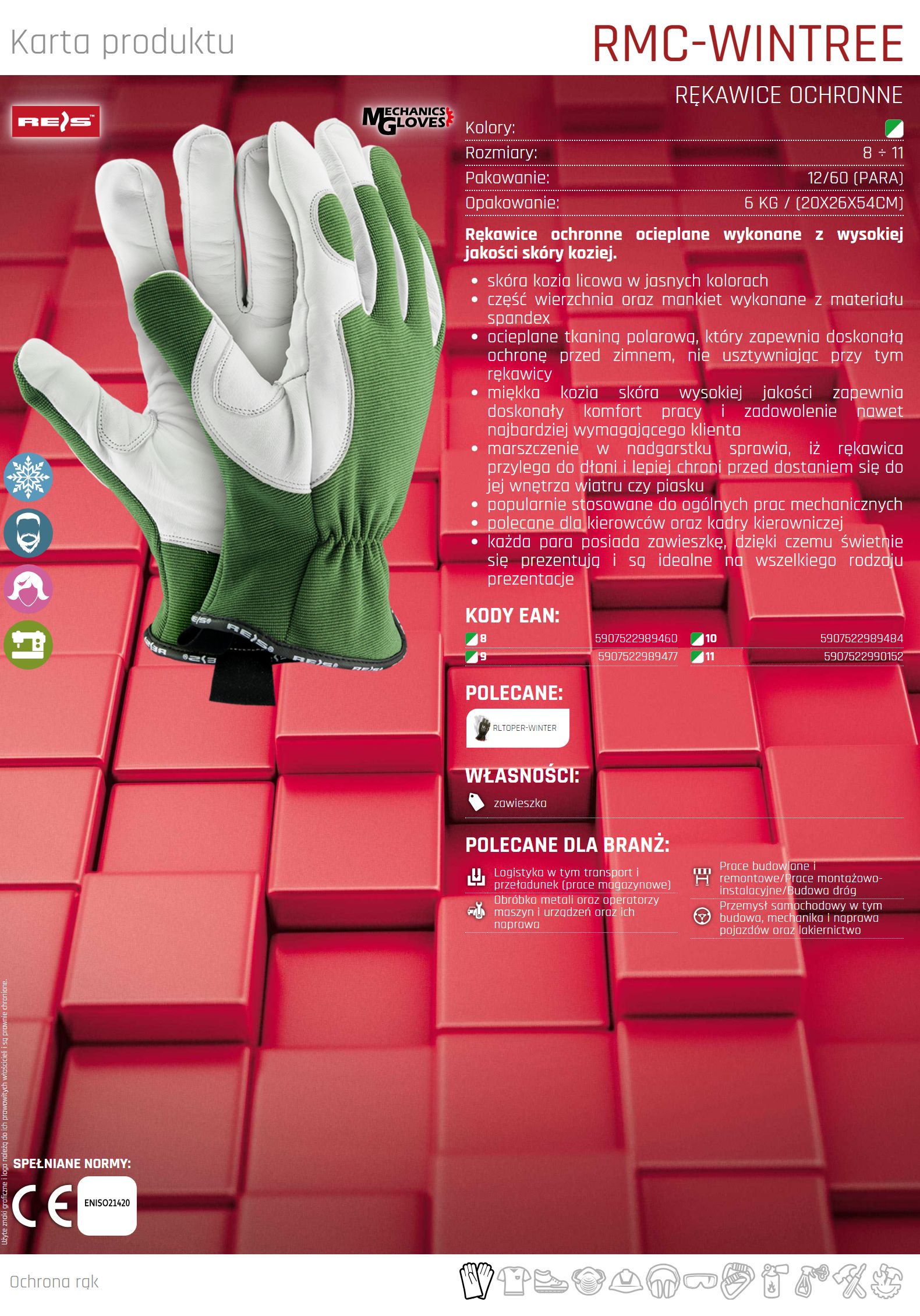 – zgodne z normami EN388 (poziomy odporności: 4 2 2 1 X), EN511 (poziomy odporności: 0 1 0) oraz EN420