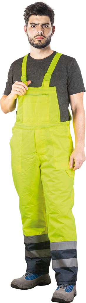 Spodnie ogrodniczki zimowe, z pasami odblaskowymi na dole nogawek.