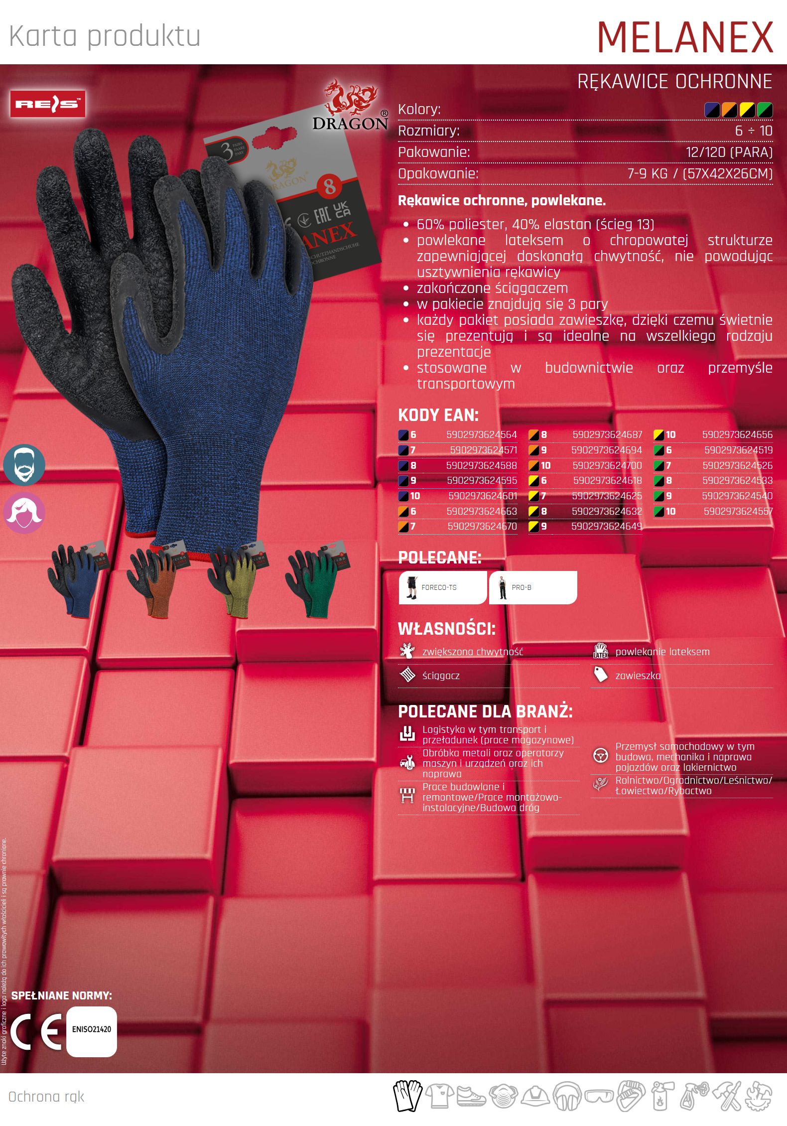 – powlekane lateksem o chropowatej strukturze zapewniającej doskonałą chwytność, nie powodując usztywnienia rękawicy