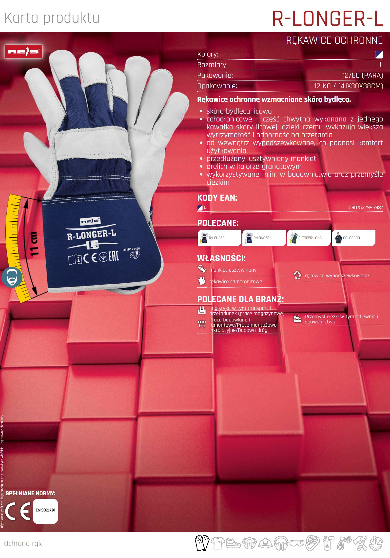 Rękawice ochronne wzmacniane skórą bydlęcą R-LONGER-L rozmiar L