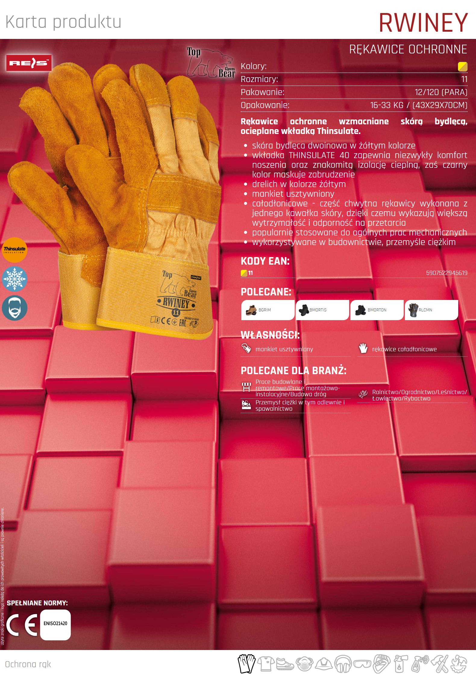 Rękawice ochronne wzmacniane skórą bydlęcą, ocieplane wkładką Thinsulate.