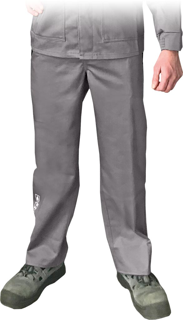 – spodnie przeznaczone do ochrony użytkownika na stanowiskach, na których występuje zagrożenie zapaleniem w wyniku krótkotrwałego zetknięcia z płomieniem, oddziaływaniem ciepła konwekcyjnego, promieniowania cieplnego, rozpryskiem stopionego żelaza oraz do prac w środowisku gdzie wymagana jest zdolność do rozpraszania ładunku elektrostatycznego w celu zapobiegania wyładowaniom zapalającym