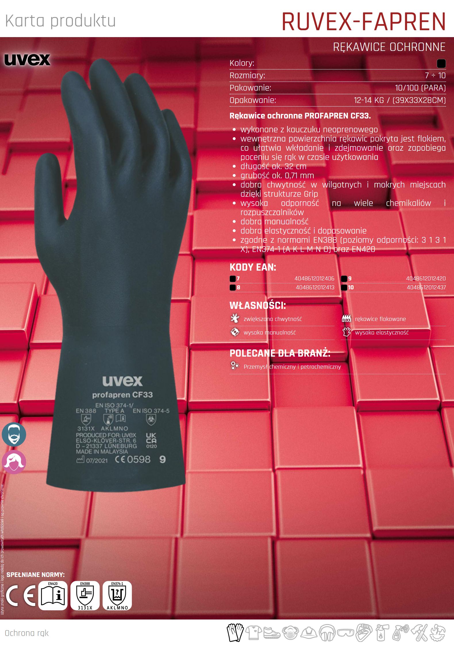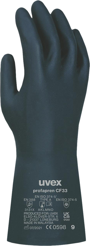 – zgodne z normami EN388 (poziomy odporności: 3 1 3 1 X), EN374-1 (A K L M N O) oraz EN420