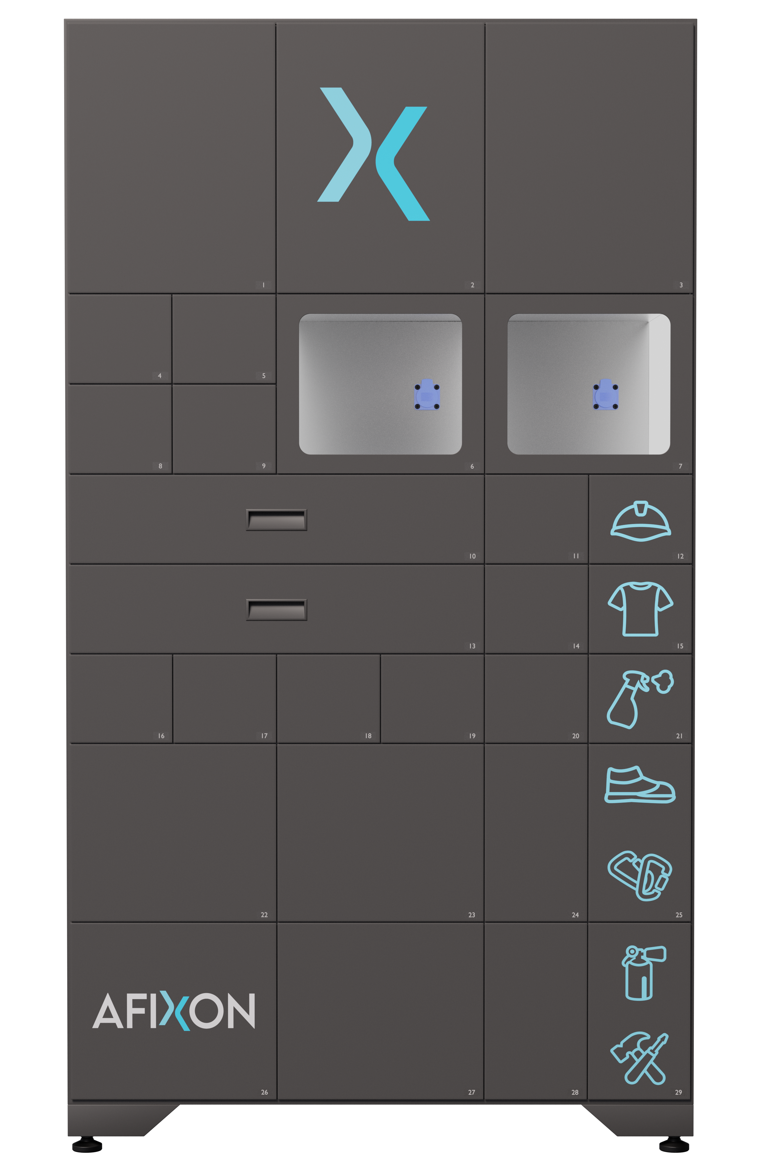 Natomiast automat AFIXON LOCK63 ma wysokość 2000 mm, pojemność 63 sztuki, szerokość 1120 mm, napięcie 230VAC-50Hz oraz maksymalną głębokość 600 mm. Skrytki mogą pomieścić obciążenie do 50 kg, a masa automatu wynosi 295 kg.